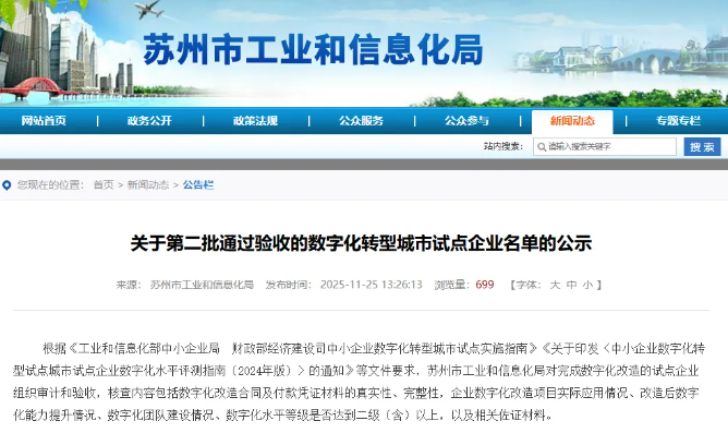 蘇州市工業和信息化局日前公示第二批通過驗收的數字化轉型城市試點企業名單,全市共186家企業入選,蘇相合作區企業蘇州力達精密配件有限公司上榜。
