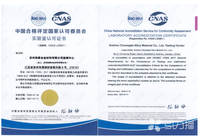 記者從蘇相合作區獲悉,合作區企業蘇州創泰合金材料有限公司(以下簡稱“蘇州創泰”)迎來重要發展里程碑,其核心研發與檢測實驗室正式獲得中國合格評定國家認可委員會(CNAS)頒發的實驗室認可證書(證書編號:CNASL23651)。據悉,這標志著蘇州創泰實驗室的管理水平與技術能力已達到國家公認標準,檢測結果將獲全球廣泛認可,為企業科技創新注入強勁動能。