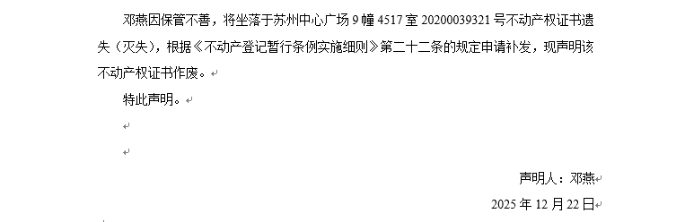 關于蘇州中心廣場9幢4517室20200039321號不動產權證書遺失聲明