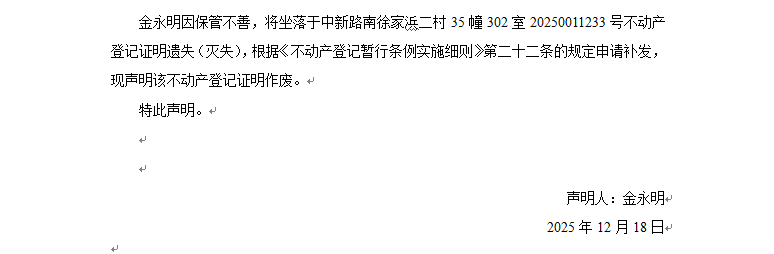 關于中新路南徐家浜二村35幢302室20250011233號不動產登記證明遺失聲明