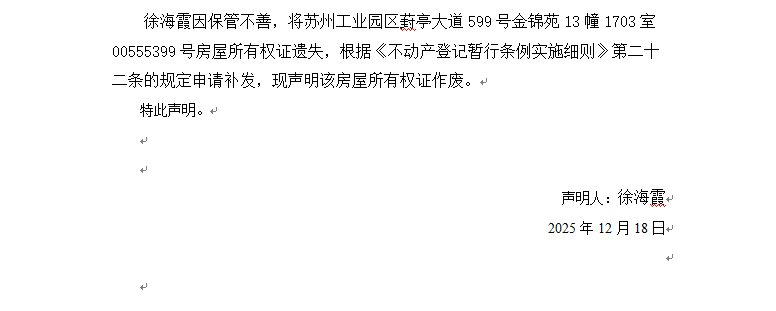 關于蘇州工業園區葑亭大道599號金錦苑13幢1703室00555399號房屋所有權證遺失聲明