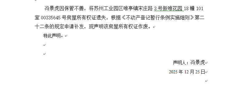 關于蘇州工業園區唯亭鎮宋莊路3號新唯花園18幢101室00335645號房屋所有權證遺失聲明