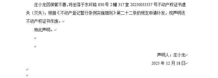 關于東環路930號2幢317室20250033337號不動產權證書遺失聲明