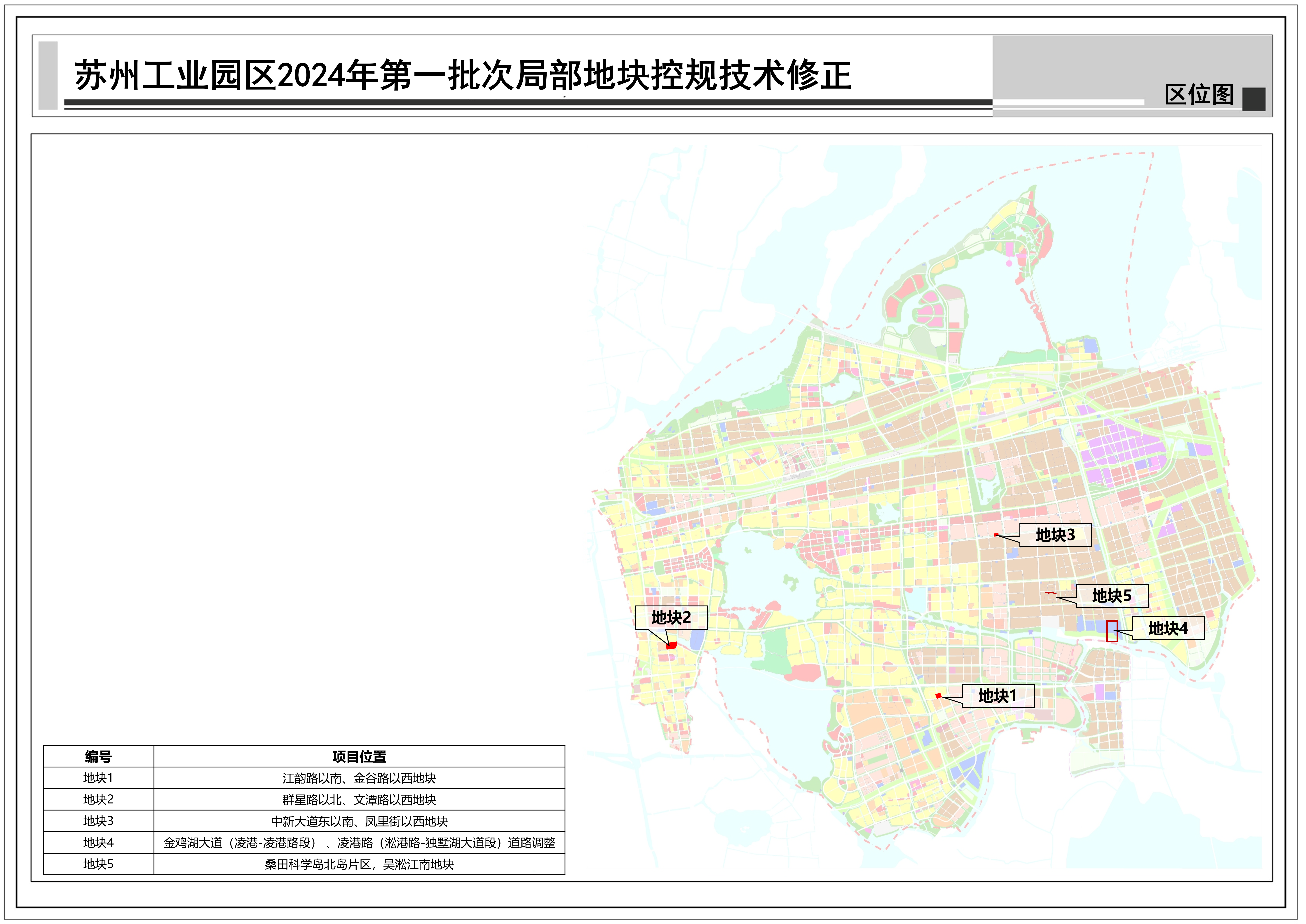 蘇州工業(yè)園區(qū)2024年第一批次局部地塊控規(guī)技術修正:共包括5個地塊,總用地面積約0.13平方公里,詳見附圖區(qū)位圖。