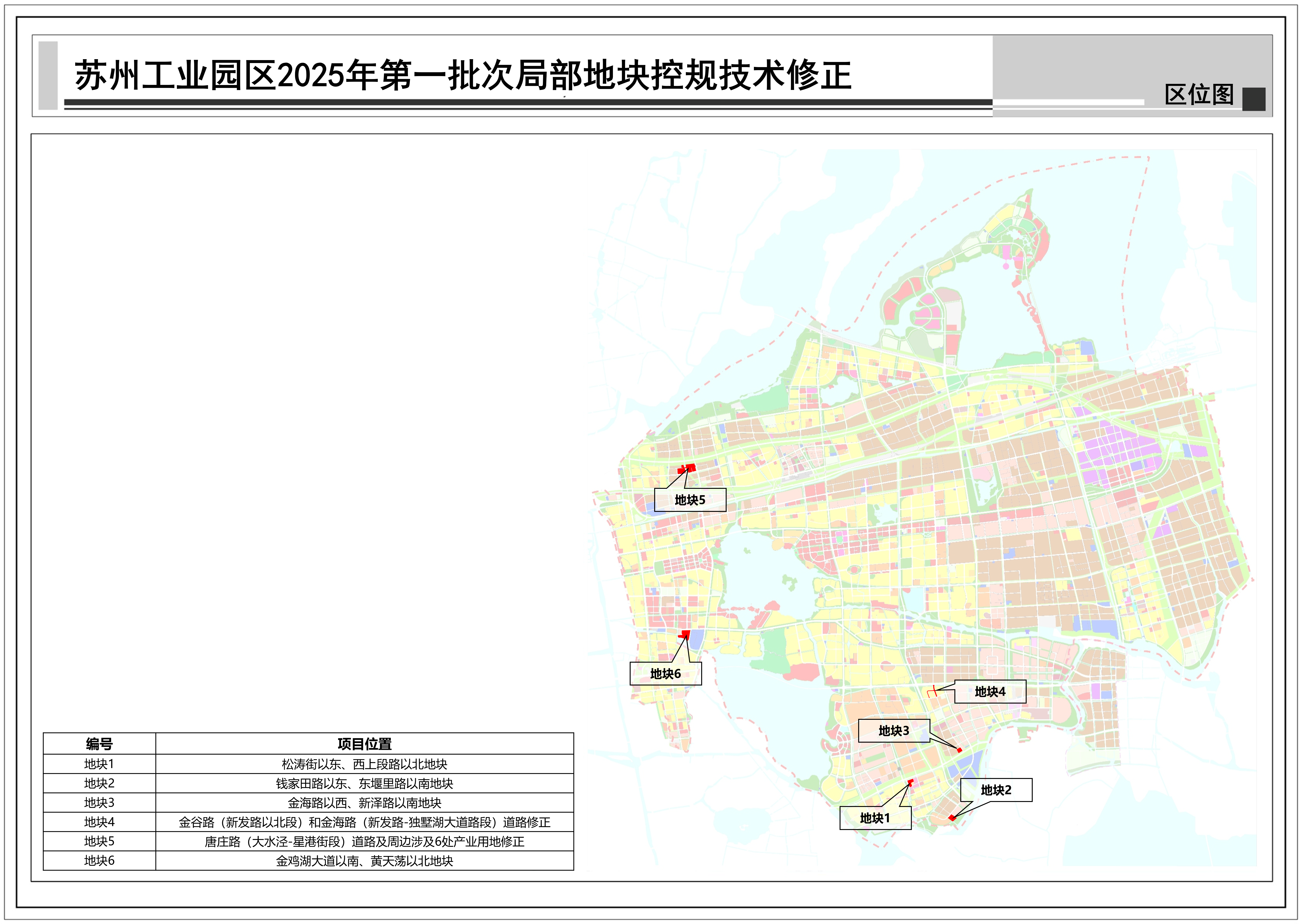蘇州工業(yè)園區(qū)2025年第一批次局部地塊控規(guī)技術(shù)修正:共包括6個(gè)地塊,總用地面積約0.29平方公里,詳見附圖區(qū)位圖。