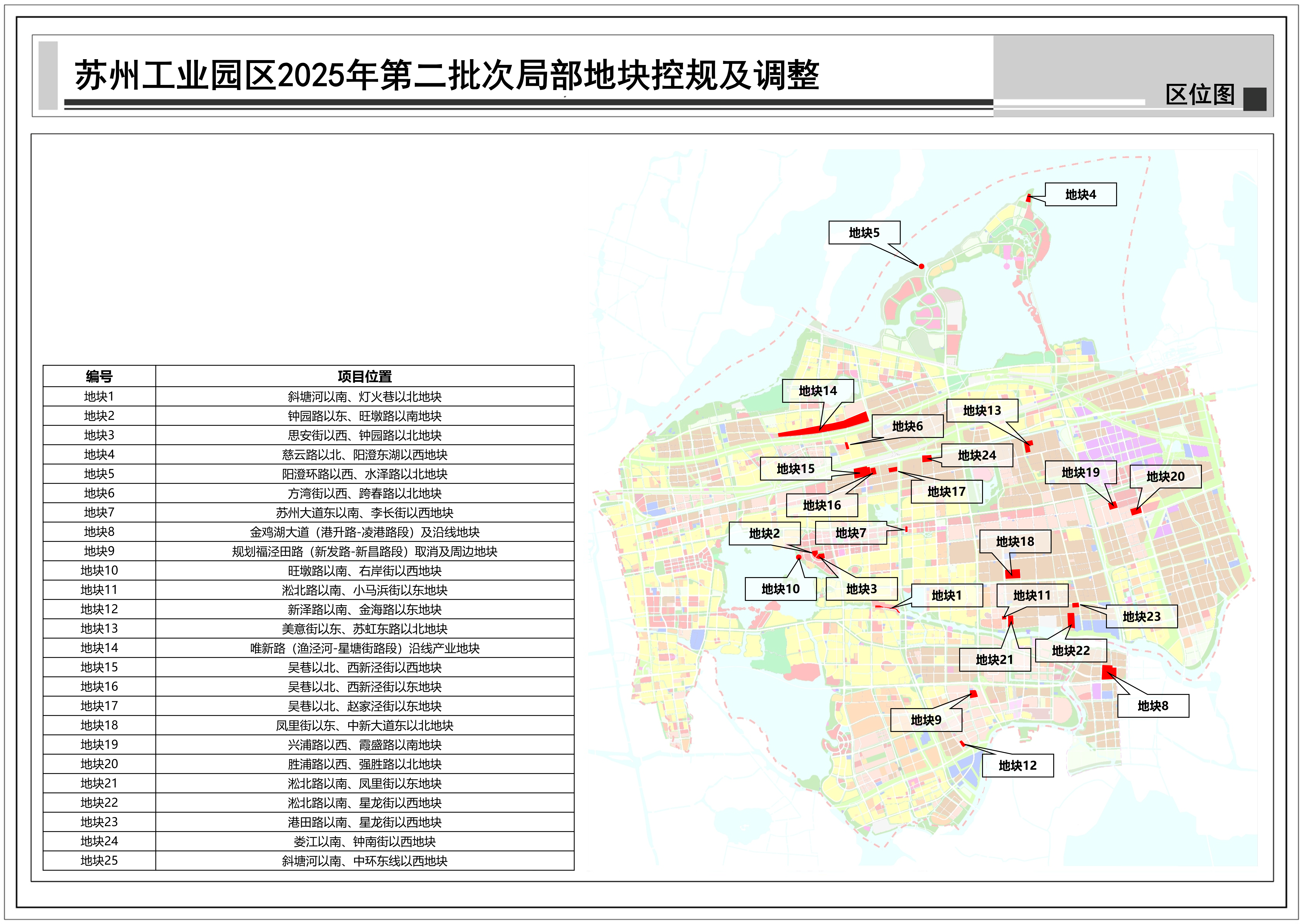 蘇州工業(yè)園區(qū)2025年第二批次局部地塊控規(guī)及調(diào)整:共包括25個(gè)地塊,總用地面積約1.76平方公里,詳見(jiàn)附圖區(qū)位圖。