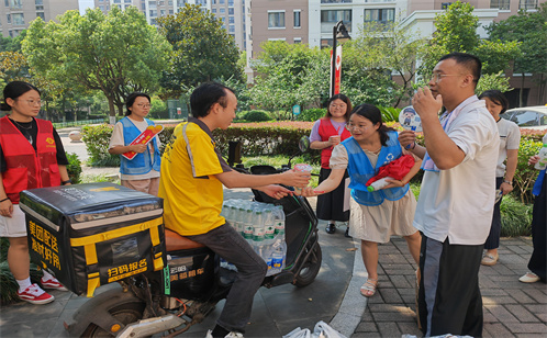 歐典社區不斷在新業態新就業群體黨建工作上積極探索,通過開展一系列活動傳達對新業態新就業群體的關注,提升其社區歸屬感以及社區參與的積極性,使其更好的融入基層社會治理。今年七月,歐典社區在美團湖東站舉行了“小典典”志愿服務隊授旗儀式,成立社區的新業態新就業群體志愿服務隊伍。在夏送清涼公益行捐贈儀式上,新業態新就業群體代表李煜烽在發言時說道:“非常感謝大家的關心關愛,未來,期待我們星騎士為主力的“小典典”志愿服務隊能積極參與到歐典社區新街口商業街商圈治理行動中來,發揮走街串巷獨特優勢,樹榜樣力量,揚社區‘新’風。”