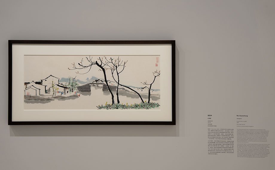 在“家園載情”部分,中新兩國的先驅(qū)和新興藝術(shù)家們以不同方式喚醒對家園的思念和依戀,從“江南水鄉(xiāng)”到“當(dāng)代都市”書寫現(xiàn)實版的“家園重逢”。該篇章包括中國著名書法家顧廷龍的書法小篆作品《錦繡河山》、藝術(shù)家吳冠中的四件水墨和油畫作品,以及新加坡當(dāng)代藝術(shù)發(fā)展先驅(qū)唐大霧創(chuàng)作的大地藝術(shù)代表作品、新加坡女性藝術(shù)家王良吟創(chuàng)作的《新女郎的故地重游》系列攝影作品等。