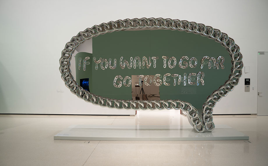 在“都市未來”部分,藝術(shù)家們暢想都市的未來樣貌,寄托對遠(yuǎn)景的期待。該篇章包括中國當(dāng)代藝術(shù)領(lǐng)域的標(biāo)志性人物徐震為本次展覽創(chuàng)作的巨型裝置《結(jié)伴才能行遠(yuǎn)》、中國新銳藝術(shù)家裴詠梅基于蘇州工業(yè)園區(qū)創(chuàng)作的《都市未來系列》最新力作,以及新加坡藝術(shù)家林育榮的影像裝置作品《海況9:公告》系列作品、新加坡著名攝影師郭景創(chuàng)作的《新加坡偶像》系列攝影作品等。