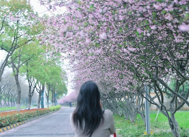 蘇州工業(yè)園區(qū)陸涇路上的海棠進(jìn)入盛花期,粉嫩的花朵開滿枝頭。