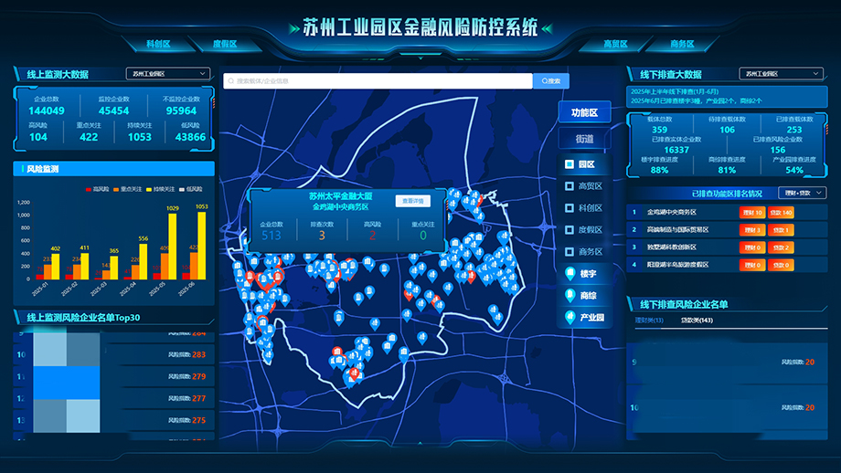 為進一步筑牢防非堅實防線,園區(qū)積極運用現(xiàn)代信息技術(shù)手段加強監(jiān)測預(yù)警。活動中,由園區(qū)金融發(fā)展和風(fēng)險防范局牽頭建設(shè)的園區(qū)金融風(fēng)險防控系統(tǒng)正式上線,整合工商、警情等44類數(shù)據(jù),疊加企業(yè)征信評分,運用9個維度、96個細化指標,為全區(qū)超14萬家企業(yè)進行科學(xué)賦分,進行分級分類處置。系統(tǒng)全程記錄監(jiān)測預(yù)警、研判定級、分類處置情況,構(gòu)建風(fēng)險企業(yè)閉環(huán)管理模式,實現(xiàn)風(fēng)險隱患一屏統(tǒng)覽、處置流程一圖掌控。