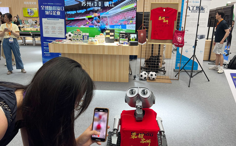 展會現場,人工智能應用也與“蘇超”隔空對話。在蘇超互動區,曾作為蘇超機器人領隊并在中場表演中展示魅力的明星機器人WAWA一邊移動一邊擺動手臂,與圍觀人群熱情互動。