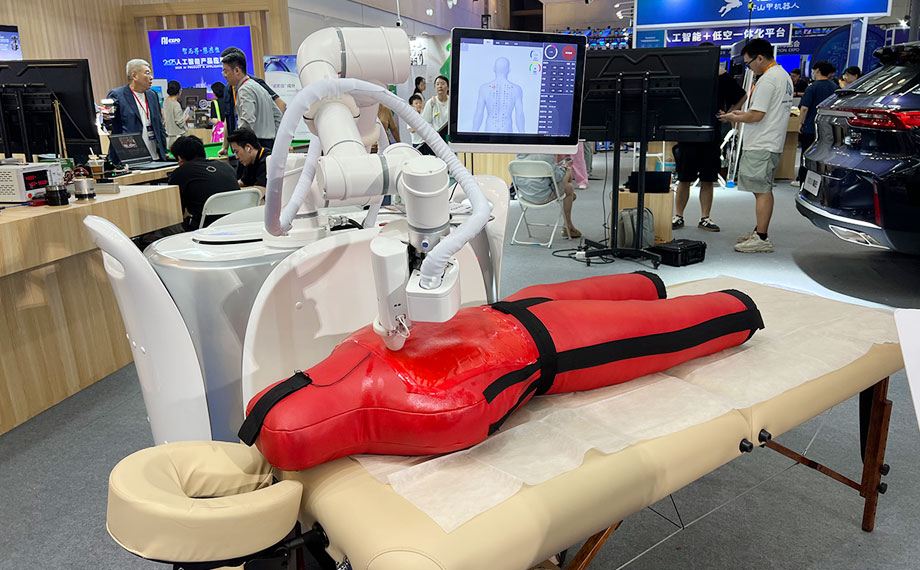 安韋澤是新加坡科技研究局的首個海外分支機構——新科研引入園區的一家科技企業,此次展會帶來按摩機器人EMMA,將千年中醫經絡理論與前沿機器人技術相融合,重新書寫“推拿”技藝的時代傳承。安韋澤項目工程師陳雪介紹,企業在園區落地了研發和生產,相關產品在中醫診所、康復機構已有應用,目前正申請國家醫療器械注冊流程,未來將讓優質康復資源惠及更多人群。