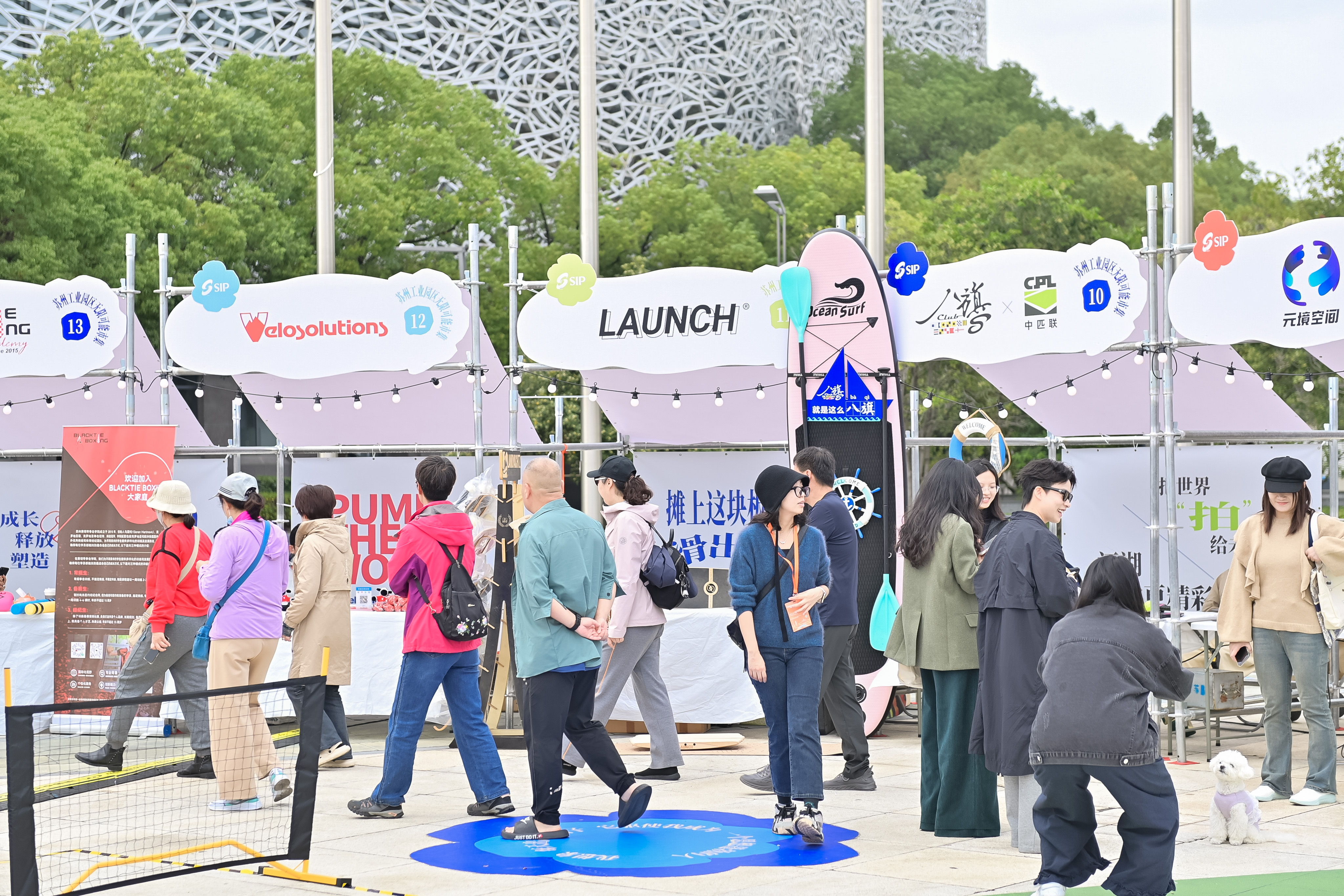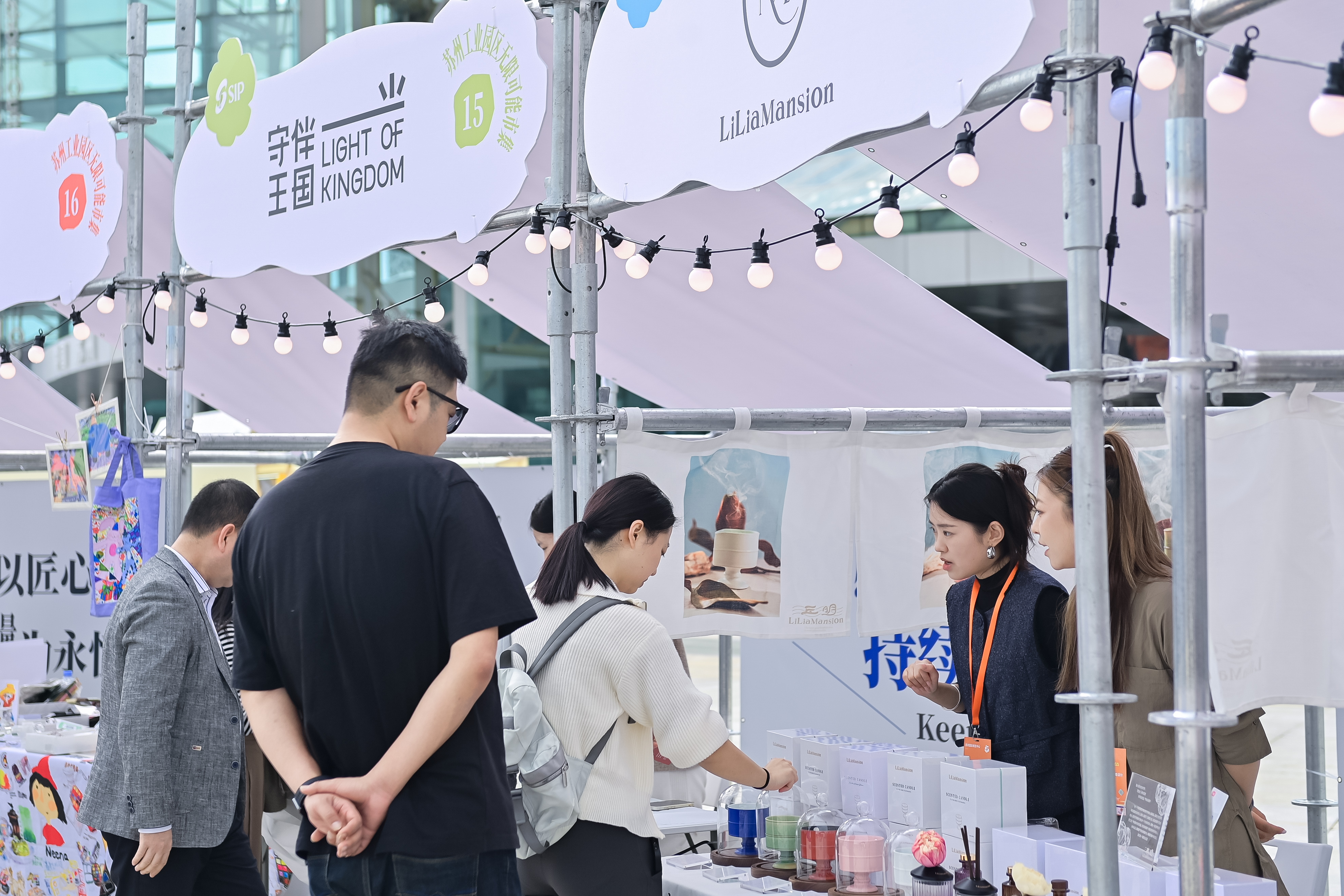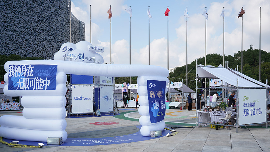 位于蘇州文化藝術中心廣場的蘇州工業園區“無限可能文創市集”同樣成為本屆文博會期間的熱門去處。以“我棲身于無限可能中”為主題,市集巧妙運用“五花瓣一花芯”的布局,將25家涵蓋詩歌、文創、寵物、科技與運動的精選商戶有機串聯。