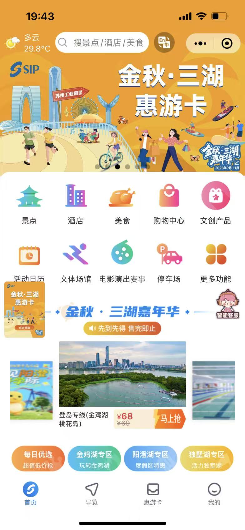 為進(jìn)一步提升市民游客的幸福感。嘉年華期間,園區(qū)發(fā)布《金秋?三湖嘉年華指南》,集中呈現(xiàn)活動(dòng)日程、推薦玩法、消費(fèi)地圖等實(shí)用信息,為市民游客暢享園區(qū)金秋文旅盛宴提供全方位指引。“金秋·三湖惠游卡”和“金秋·三湖嘉年華消費(fèi)券”,則匯聚千余家商戶(hù)實(shí)實(shí)在在的優(yōu)惠,以及50余場(chǎng)演出、近20場(chǎng)體育賽事和40余場(chǎng)展覽展會(huì),覆蓋餐飲、住宿、文旅、會(huì)展、汽車(chē)等重點(diǎn)消費(fèi)領(lǐng)域。游客可以通過(guò)“惠游園區(qū)”公眾號(hào)、“數(shù)字金雞湖”、“同程旅行”小程序等平臺(tái),領(lǐng)取專(zhuān)屬折扣與滿(mǎn)減禮遇,將出行、住宿、消費(fèi)一手掌握。此外,憑借演藝賽事門(mén)票,還能兌換通用消費(fèi)券及商家專(zhuān)屬禮包,延伸文旅體驗(yàn),盡享“票根+”福利。