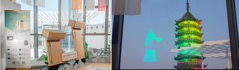 在蘇州絲綢博物館“未來館”二樓,基于虛實融合透明空間顯示打造的懸空成像打卡裝置已實現(xiàn)落地應(yīng)用,體驗者無需佩戴VR、AR等設(shè)備即可感受裸眼3D動態(tài)場景呈現(xiàn)。裝置巧妙融合北寺塔實景與數(shù)字影像:窗外的千年古塔與屏中的三維動態(tài)模型交相輝映,為觀眾營造出時空交疊的沉浸式體驗。