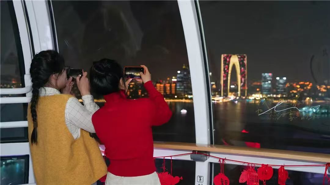 潮趣游樂,別致休閑,金雞湖畔歡樂多!春節期間,園區地標“蘇州之眼”摩天輪推出“馬上轉運”馬年新春主題活動,以128米高空為核心舞臺,融合云端祈福、云端餐飲、互動演藝,為市民游客打造了一場兼具傳統韻味與現代風情的新春盛宴。