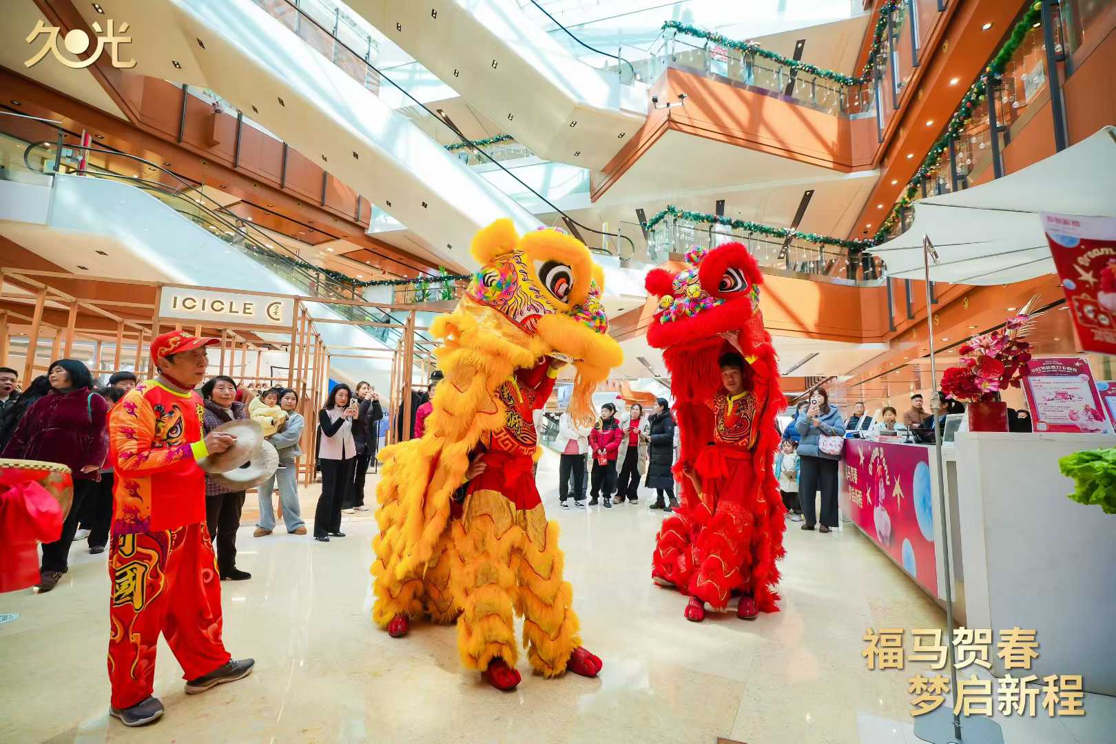 非遺演出更是精彩紛呈。木鳥象劇團帶來的非遺燈彩主題巡游將剪紙、年畫、風箏等元素幻化于華服與燈彩,交織成流動的光影劇場;大年初一,夏國璋龍獅團以梅花樁、一柱擎天等高樁表演獻上了精彩的開年好戲。