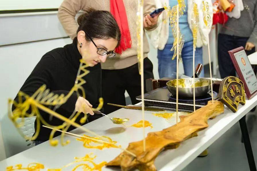 “糖畫不僅是一道美食,更是中國人對甜蜜生活、吉祥如意的寄托?!碧钱嫾妓噦鞒腥死瞵幍闹v解娓娓道來。在他的指導下,外籍學子們迫不及待展開體驗,他們親手執勺、以糖為墨,嘗試勾勒出駿馬、燈籠等寓意吉祥的新春元素。金黃色的糖漿如絲綢般流淌,眨眼間,一個個生動的圖案便在光潔的石板上凝固成型,引得陣陣驚嘆。