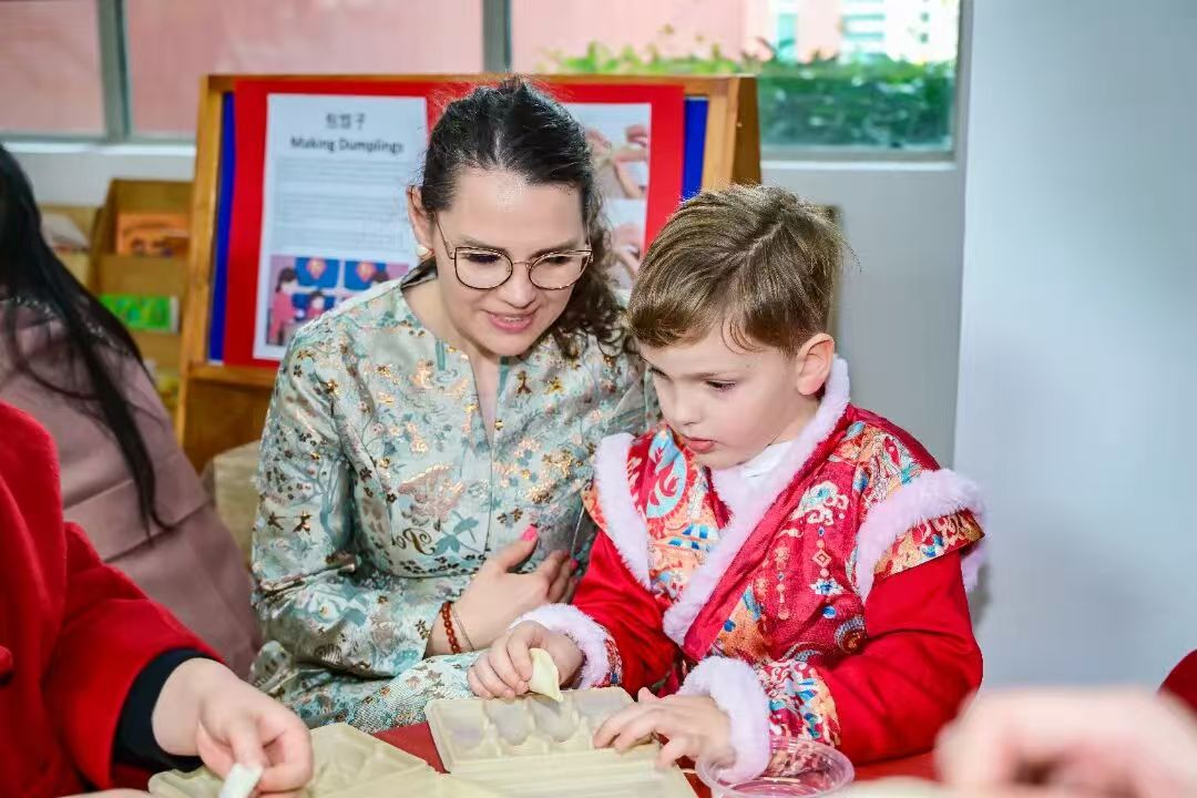 事實上,SSIS的新春慶祝遠不止一場音樂會,學校還打造了精彩的集會和沉浸式體驗活動,各學部也開展了豐富多彩的新年主題活動:幼兒園游園會上,金發碧眼的小朋友剪起了窗花;小學部集會中,孩子們分享了各自對春節的理解;中學部主題活動中,舞龍舞獅、寫福字成為最受歡迎的環節。校園的每一處都被中國紅妝點,每一張臉上都映照著節日的暖光。