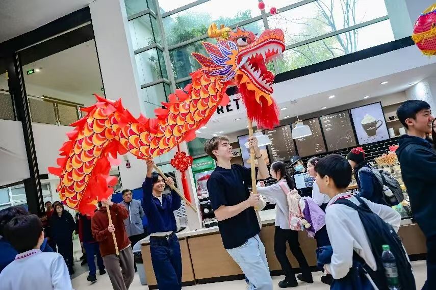慶典融合了氣勢恢宏的舞龍舞獅,以及精妙絕倫的川劇變臉,各學部也推出了獨具特色的慶?;顒?。其中,中學部開展以“文化融合”為主題的劇院盛會,呈現合唱、民樂、戲曲串燒等節目;小學部通過盛裝巡游,涵蓋鼓樂、舞蹈、短劇等豐富形式的表演集會,以及可以體驗十余項傳統手工藝的年味集市歡慶佳節;幼兒園的孩子們則在趣味手工坊中,通過制作馬頭帽、體驗拓印、毛氈畫等游戲化活動,快樂觸摸傳統節日的脈搏。