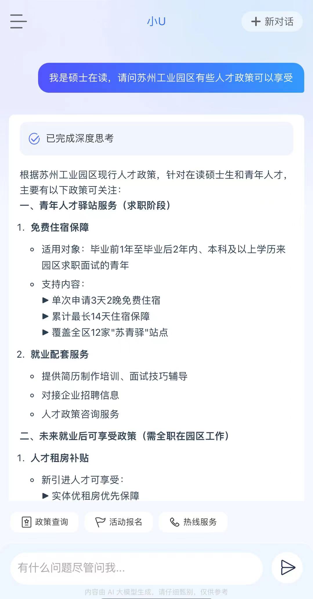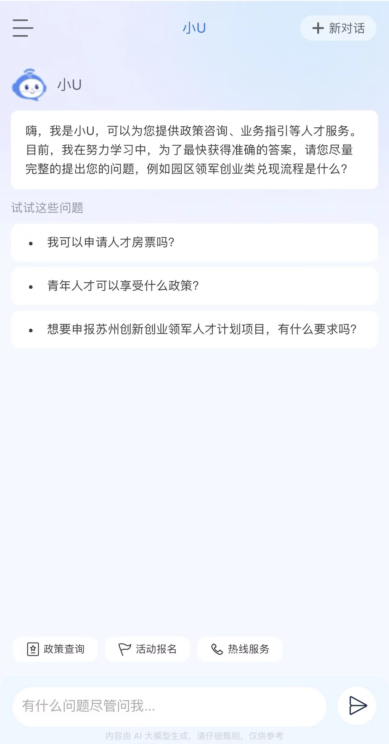 “SIP才無憂”深度聚焦提升人才的使用體驗,通過接入DeepSeek-R1“滿血版”,全新推出首個高智版AI助手“小U”,構建智能化人才服務體系,實現(xiàn)“政策秒配、服務無界”。