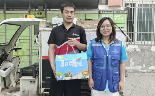 炎炎夏日,驕陽似火,新業態從業者們依舊穿梭在大街小巷,為居民生活帶來便利。為了傳遞對新業態從業人群的關愛,表達對他們的敬意,淞潭社區暖心開啟“夏日送清涼”騎士節愛心活動貼心籌備了包含生活用品避暑產品物品的夏日清涼禮包。活動現場,熱浪襲人,社區專職網格員為正在轄區內奔波忙碌的新就業群體送上滿含心意的清涼禮包。“天熱千萬注意防暑!”暖心的話語伴隨著沉甸甸的禮包一一送到外賣騎手、快遞員等新業態人群手中。這份“清涼”不僅驅散了夏日的燥熱,更讓他們在忙碌的工作中感受到社區的關懷與敬意,讓奔波的路上多了一份溫暖與動力。
