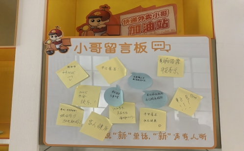 這里召開了“就業群體座談會”,通過面對面與美團、餓了么、叮咚買菜等小哥交流,了解他們的實際需求等。客廳內設置有“小哥留言板”,讓您心煩可傾訴、“新”聲有人聽。