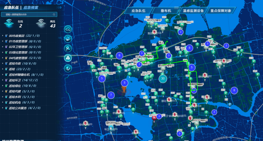 依托具備感知終端的監測與調度平臺,市政服務集團構建起“感知-傳輸-分析-應用”的清雪除冰應急保障管理閉環。系統一旦感知結冰風險條件形成,能夠自動觸發預警信息,并生成作業建議,快速鎖定預警點位,啟動精準處置,改變傳統“憑經驗、靠巡查”的被動模式。平臺界面實現預警點位、應急隊伍、撒布機作業線路的多圖層疊加展示,支持應急資源實時調度與動態跟蹤,應急處置效能顯著提升。