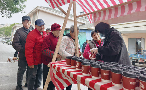 一碗熱氣騰騰的湯圓,是這場(chǎng)相聚中溫情的注腳。金益社區(qū)小區(qū)門口甜香四溢,社區(qū)工作人員、物業(yè)人員和“紅色管家”志愿者們?cè)缭缰蠛脺珗A,保溫靜置、分裝整齊,遞予過往居民。大家捧著溫?zé)岬拇赏耄腥爽F(xiàn)場(chǎng)品嘗,有人打包分享,一句句“謝謝”“趁熱吃”讓暖意在街巷間流動(dòng)。志愿者們還將湯圓送到保安、保潔手中,致敬這些默默堅(jiān)守一線的守護(hù)者。
