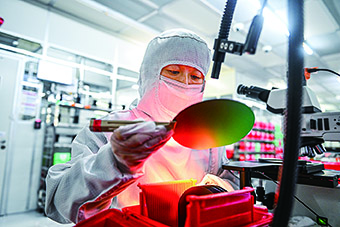 ▲在蘇州工業園區納米產業技術研究院有限公司,工作人員在生產車間檢查晶圓質量。本報記者 季春鵬攝