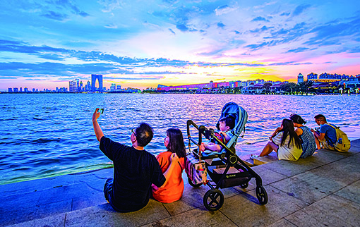 ▲金雞湖畔,人們在欣賞晚霞并留影(2021年7 月29 日攝)。