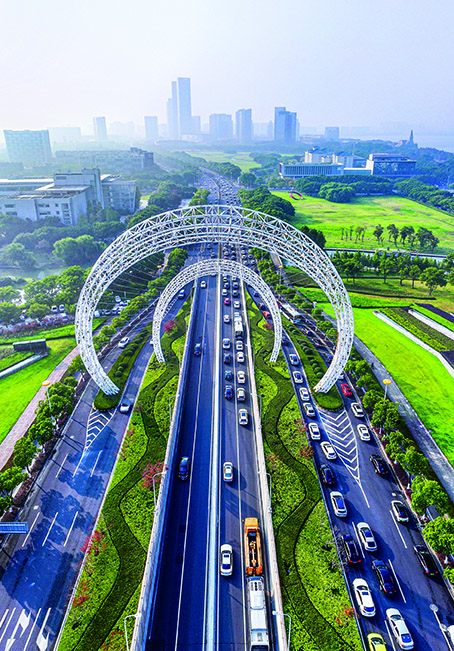 ▲車輛從蘇州工業園區雕塑《升華》下通行(2024 年11月 13 日攝)。 本報記者 季春鵬攝