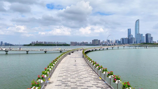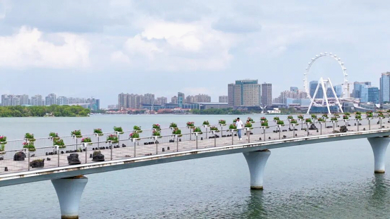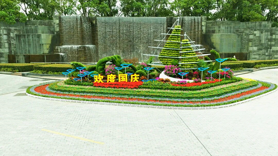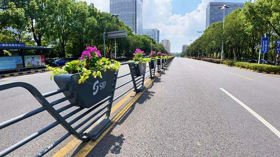 The floral display at Guobin Road is eye-catching. It features a shape of a sailing boat surging through ocean waves, with fish swimming and birds soaring around. A vibrant mix of nearly 30,000 pots of seasonal flowers and ornamental plants forms the layered base, creating a rippling effect. The display symbolizes the unstoppable momentum of SIP’s development.