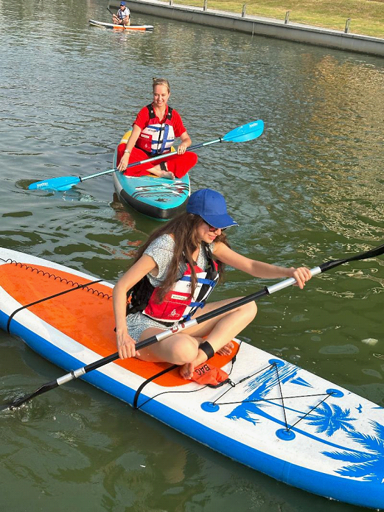 In the afternoon, the young people toured the Central (Zhongyang) River in boat, and experienced paddleboarding.
