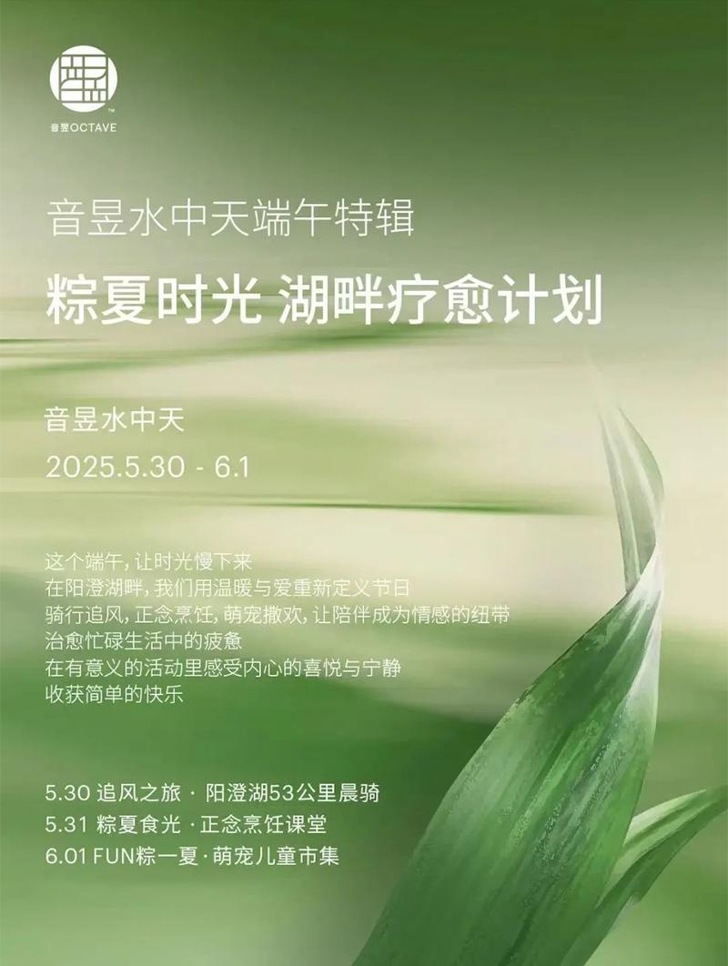 音昱水中天推出端午特輯“粽夏時光 湖畔療愈計劃”,邀你在陽澄湖畔騎行追風、正念烹飪、萌寵撒歡,讓時光慢下來,讓陪伴成為情感的紐帶,在有意義的活動里感受內心的喜悅與寧靜,收獲簡單的快樂。