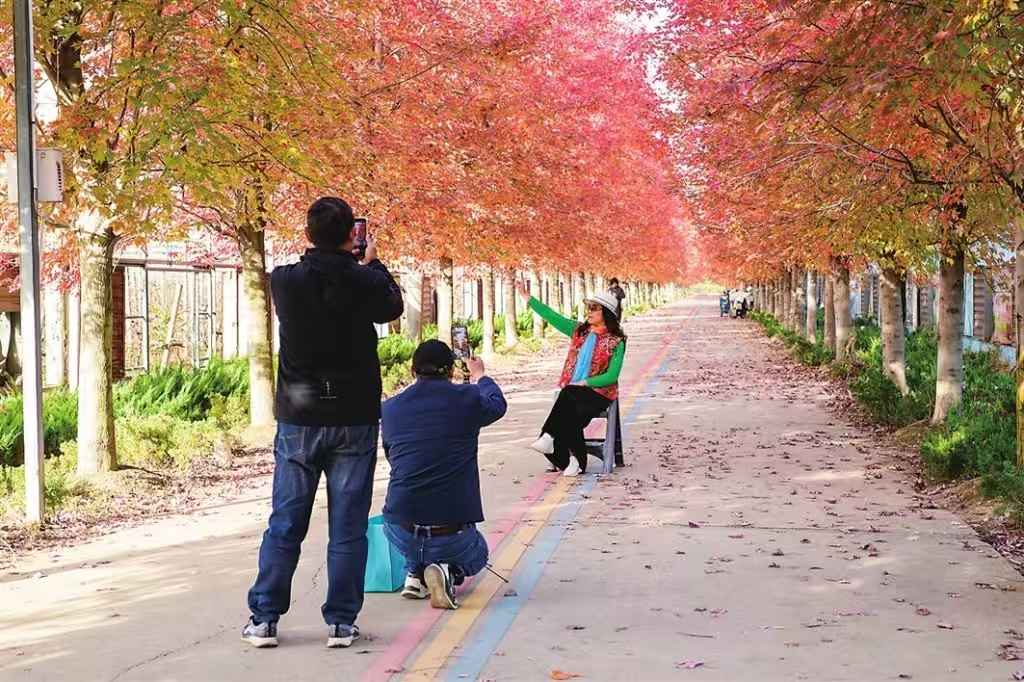 昨天,園區(qū)陽澄湖半島浦田生態(tài)農(nóng)業(yè)園紅楓大道丹楓如火,吸引了眾多游客前來賞楓。