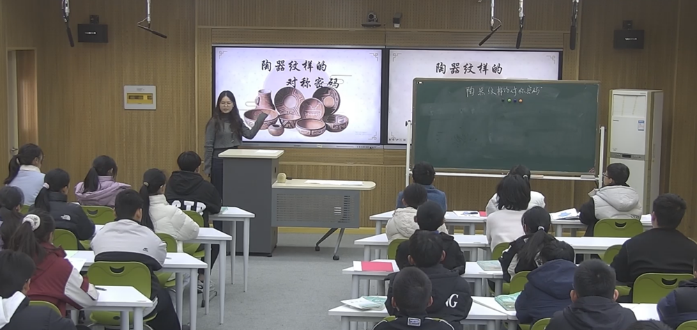 唯亭學(xué)校張迪老師的《陶器紋樣的對(duì)稱密碼》,項(xiàng)目從傳統(tǒng)陶器紋樣入手,引導(dǎo)學(xué)生通過(guò)分類、觀察與建模,探索紋樣背后蘊(yùn)含的平移、翻折、旋轉(zhuǎn)等圖形變換規(guī)律。在探究環(huán)節(jié),學(xué)生不僅深入分析了紋樣中的對(duì)稱奧秘,還結(jié)合數(shù)列知識(shí),解密了阿基米德螺旋線與等比螺旋線的“生長(zhǎng)”邏輯。在實(shí)踐環(huán)節(jié),同學(xué)們動(dòng)手還原螺旋線圖案,并運(yùn)用密鋪原理自主設(shè)計(jì)創(chuàng)意紋樣,在歷史之美與數(shù)學(xué)之理的融合中,深化了幾何直觀與空間想象能力。這堂課生動(dòng)展現(xiàn)了數(shù)學(xué)與人文的深度聯(lián)結(jié),體現(xiàn)了跨學(xué)科教學(xué)的創(chuàng)新與實(shí)踐。