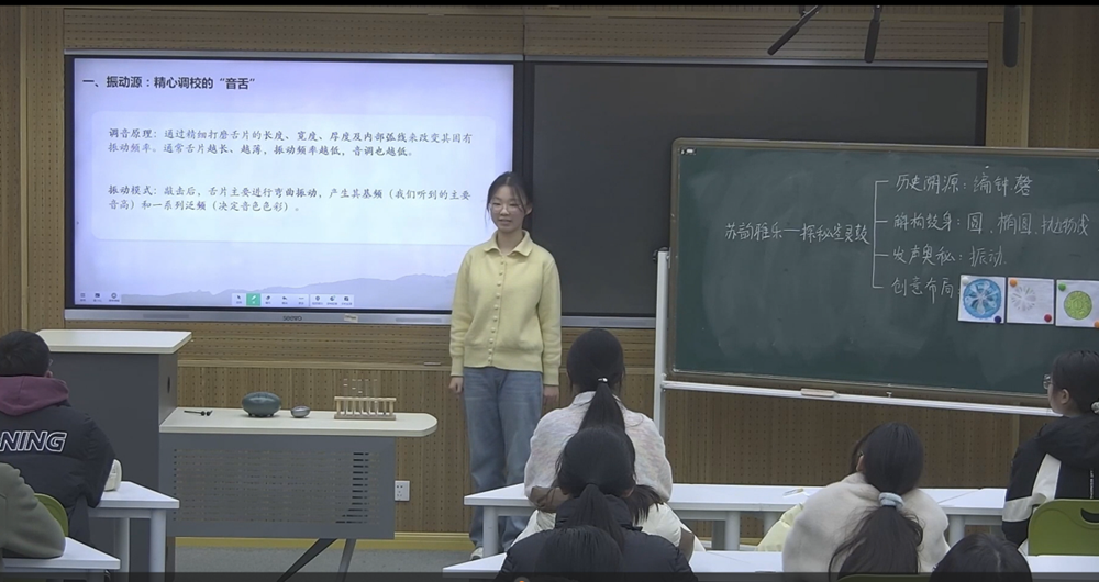 唯亭學(xué)校單夢(mèng)琦老師的《蘇韻雅樂(lè)—探秘空靈鼓》以空靈鼓為載體,引導(dǎo)學(xué)生用幾何知識(shí)解析鼓身:通過(guò)俯視圖計(jì)算圓的扇形面積與弧長(zhǎng),借側(cè)視圖建立拋物線函數(shù)模型。進(jìn)而探究發(fā)聲原理,發(fā)現(xiàn)音舌長(zhǎng)度與振動(dòng)頻率的負(fù)相關(guān)關(guān)系,并理解共鳴腔體對(duì)聲音的放大作用。最后,學(xué)生化身樂(lè)器設(shè)計(jì)師,運(yùn)用對(duì)稱、序列與螺旋布局,親手規(guī)劃音階排列。整堂課將數(shù)學(xué)、物理與藝術(shù)創(chuàng)造深度融合,讓公式成為解讀藝術(shù)、設(shè)計(jì)聲音的生動(dòng)語(yǔ)言。