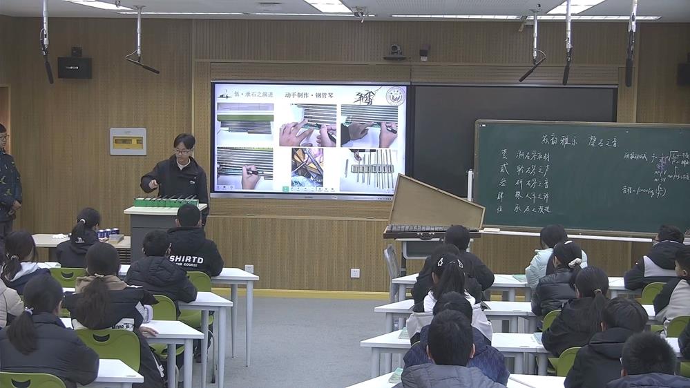 唯亭學(xué)校許計(jì)懿老師在項(xiàng)目《蘇韻雅樂(lè)·磬石之音》中,帶領(lǐng)學(xué)生探索古人以石制琴的原理。一曲石琴演奏,讓學(xué)生初步體悟石琴的聲色音調(diào);從琴鍵構(gòu)造出發(fā),發(fā)現(xiàn)長(zhǎng)度對(duì)音調(diào)的影響,通過(guò)實(shí)驗(yàn)測(cè)量出具體數(shù)據(jù),作圖驗(yàn)證得出發(fā)聲原理弦振動(dòng)公式中的弦密度為定值,且與弦長(zhǎng)呈負(fù)相關(guān);結(jié)合對(duì)數(shù)函數(shù)圖像,理解人耳對(duì)音程的對(duì)數(shù)翻譯過(guò)程;根據(jù)石琴的現(xiàn)代形態(tài)轉(zhuǎn)變,學(xué)生動(dòng)手制作了由不銹鋼管、易拉罐為原材料的敲琴,將項(xiàng)目研究成果運(yùn)用到具體實(shí)踐中,深刻感受數(shù)學(xué)知識(shí)在跨學(xué)科探究中的獨(dú)特魅力與實(shí)用價(jià)值。