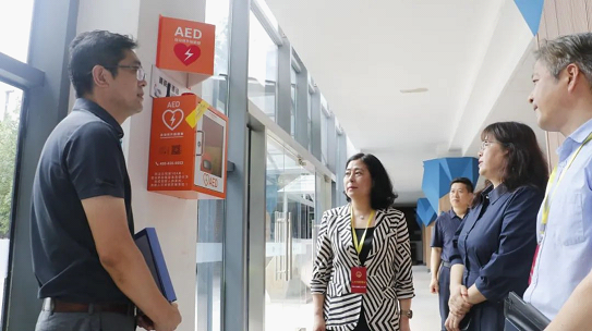 調研組一行首先前往玲瓏灣社區(qū),實地考察社區(qū)內AED的安裝位置、設備維護及公眾可及性等情況。隨后,走進西安交通大學蘇州附屬初級中學,深入了解了校園內AED的配置數量、標識指引以及師生培訓情況。